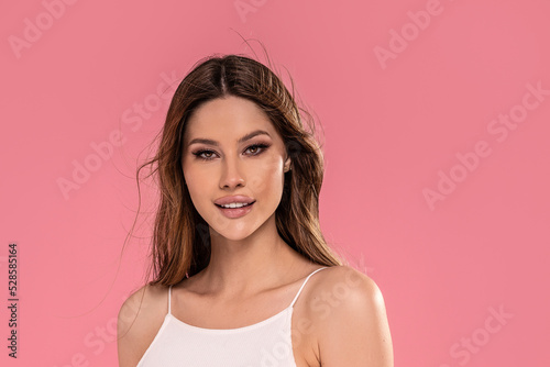 Portrait of beautiful young woman with glamour makeup and brown eyes. Smiling brunette with long hair.