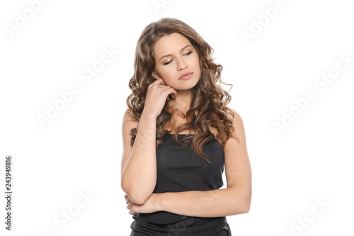 Portrait of beautiful young woman with shiny wavy hair on white background