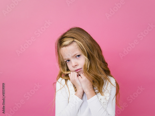 portrait of blond pretty girl in front of pink background with different emotions in the studio