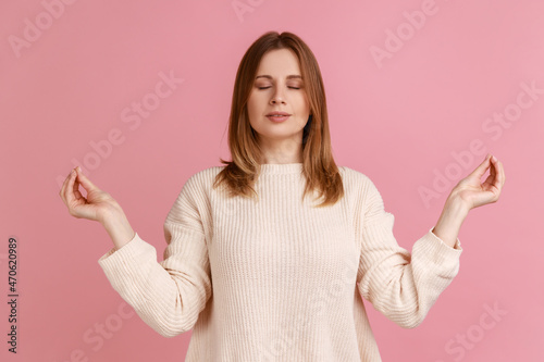 Portrait of blond woman closing eyes and holding hands up in mudra gesture, meditating, yoga exercise to reduce stress, wearing white sweater. Indoor studio shot isolated on pink background.