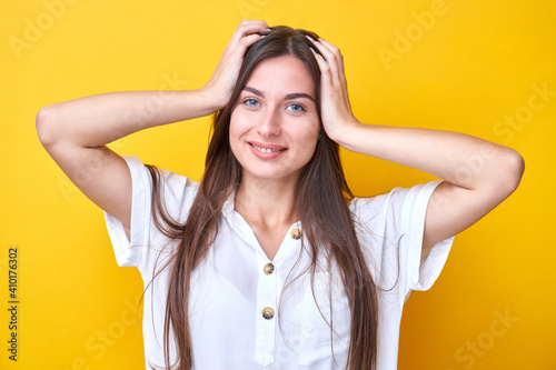 Portrait of brunette girl holding her head, smiling and rejoicing isolated on yellow background
