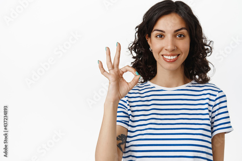Portrait of brunette girl with white perfect smile, shows okay OK gesture, approve and like, agree or say yes, standing in t-shirt against white background
