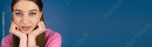 Portrait of brunette teenager looking at camera isolated on blue, banner.