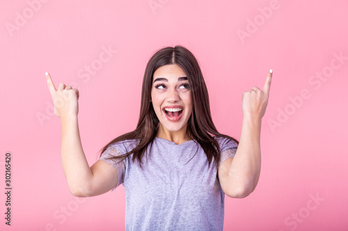 Portrait of brunette woman with long hair in basic t-shirt rejoicing and pointing finger at copyspace isolated over pink background