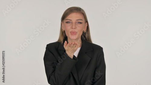 Portrait of Businesswoman Blowing Flying Kiss on White Background