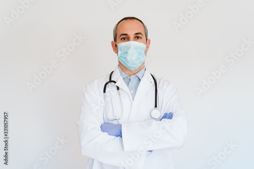 portrait of caucasian doctor using protective gloves and mask. Chinese Corona virus concept. 2019-nCoV