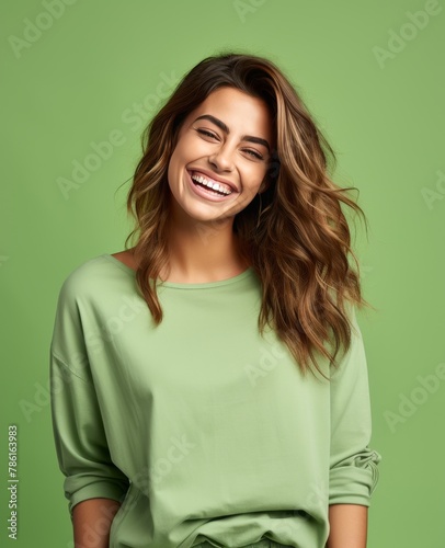 Portrait of caucasian girl, wearing a casual clothing and smiling on studio color background