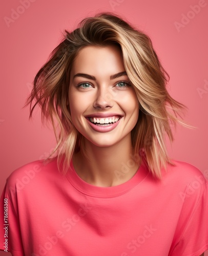 Portrait of caucasian girl, wearing a casual clothing and smiling on studio color background