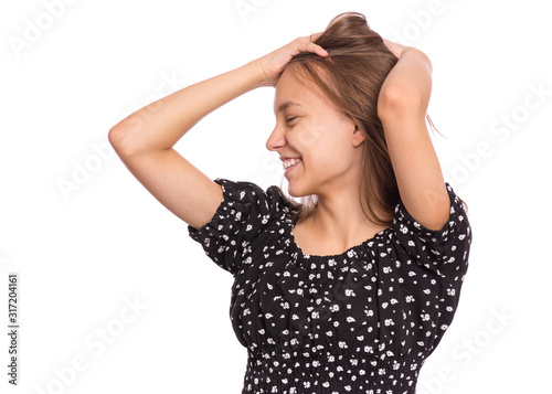 Portrait of caucasian teen girl, isolated on white background. Beautiful young teenager smiling with wind in her hair. Happy cute child laughing.