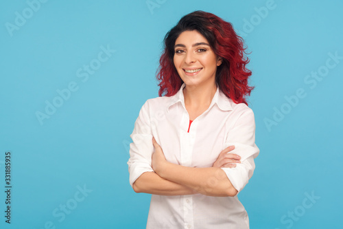 Portrait of charming happy woman with fancy red hair in white shirt holding hands crossed and smiling to camera, contented with life, charismatic individuality. indoor studio shot blue background