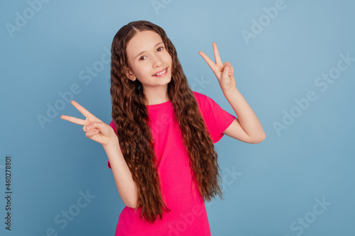 Portrait of charming lovely little lady show two v-sign shiny white smile on blue background