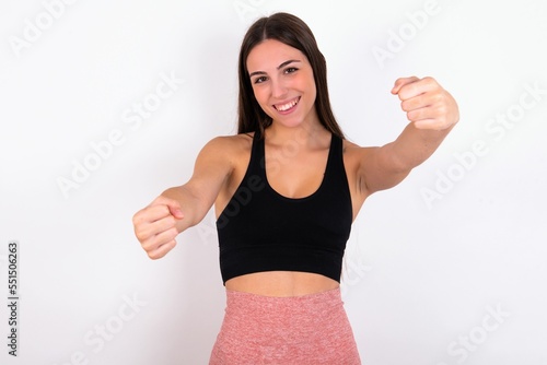Portrait of charming MODEL, smiling broadly while holding hands over her head. Confidence and relax concept.