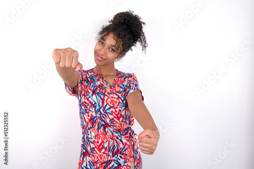 Portrait of charming Young African American woman wearing colourful dress over white wall, smiling broadly while holding hands over her head. Confidence and relax concept.