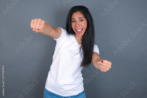 Portrait of charming young beautiful brunette woman wearing white t-shirt over grey background, smiling broadly while holding hands over her head. Confidence and relax concept.