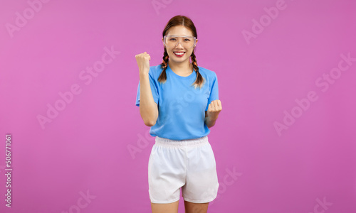 Portrait of cheerful asian girl looking at camera, advertising promotion, standing isolated on pink background