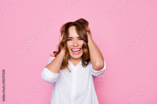 Portrait of cheerful joyful beautiful attractive woman with toothy smile open mouth, she is having fun, laughing and touching her curly brown hair, isolated on bright pink background