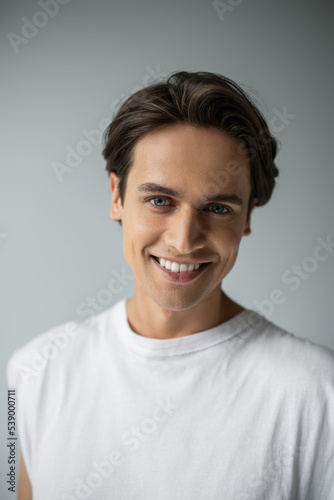 portrait of cheerful man with blue eyes looking at camera while posing isolated on grey