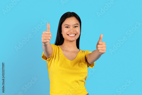 Portrait of cheerful pretty young chinese woman in yellow t-shirt show thumbs up gesture, recommend ad