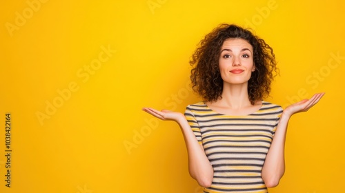Portrait of cheerful promoter young lady choosing palm empty space balance ad concept