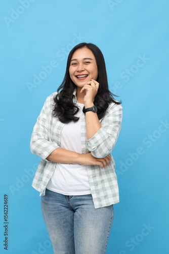 Portrait of cheerful young asian woman, smiling looking at camera, folding hands, touching cheek with finger, standing isolated on blue background.