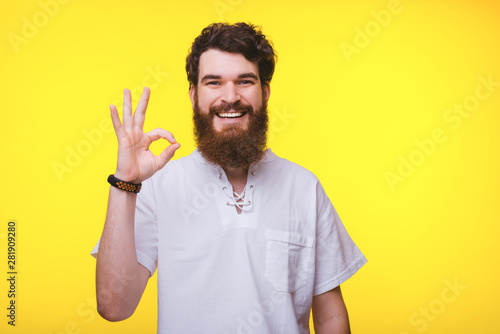 Portrait of cheerful young bearded man showing OK gesture over yellow background
