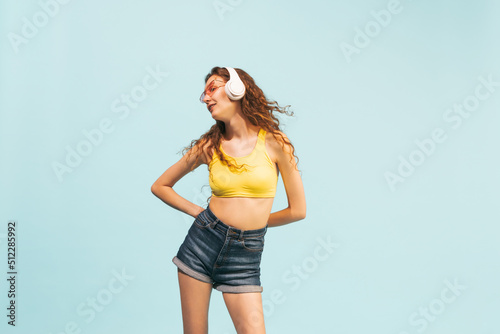 Portrait of cheerful young girl in summer outfit listening to music in headphones, dancing isolated over light blue studio background