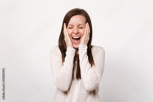Portrait of cheerful young woman in light clothes keeping eyes closed, putting hands on cheeks isolated on white background in studio. People sincere emotions, lifestyle concept. Mock up copy space.