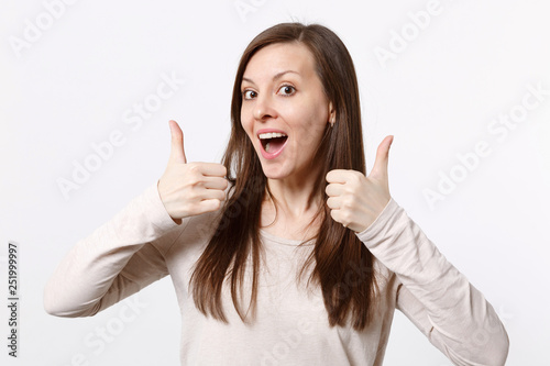 Portrait of cheerful young woman in light clothes keeping mouth open and showing thumbs up isolated on white wall background in studio. People sincere emotions lifestyle concept. Mock up copy space.