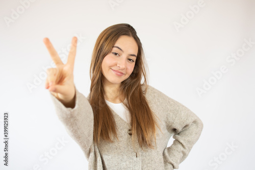 Portrait of cheerful young woman showing two fingers or victory gesture, over white background