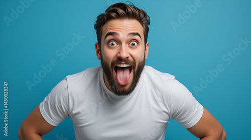 Portrait of comic positive man with beard wearing white T-shirt looking cross-eyed, having fun with silly face expression, showing tongue out. Indoor studio shot isolated on blue background.