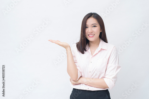 portrait of confident businesswoman wearing pink shirt isolated over white background studio