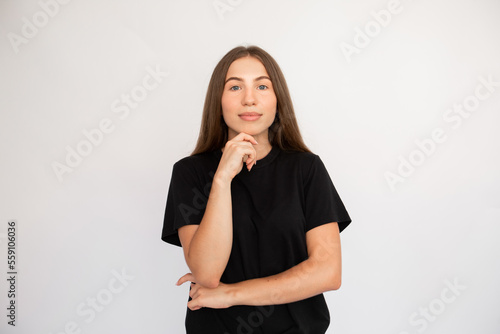 Portrait of confident young woman looking at camera over white background. Caucasian lady wearing black T-shirt posing with hand on chin. Confidence concept