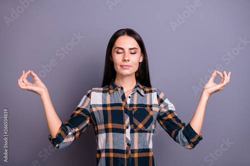 Portrait of content glad cute youngster cute have training fit close eyes spirit want pleasure rest wear fashionable checkered clothing isolated on argent background