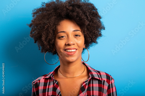 Portrait of cool young black woman laughing against blue wall - Imagem