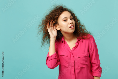 Portrait of curious african girl in casual clothes eavesdrop with hearing gesture isolated on blue turquoise wall background in studio. People sincere emotions, lifestyle concept. Mock up copy space.