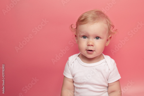 Portrait of cute adorable Caucasian baby girl with blue eyes and curly hair on pink background looking in camera.