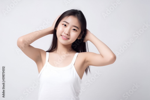 Portrait of Cute Asian Woman, She raises her arm to show her Smooth armpit skin and looks at the camera on a White background in Studio light. generative AI.