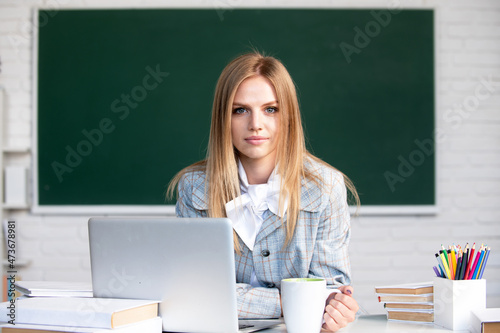 Portrait of cute attractive young woman student in university or high school college. Webinar e-learning at school, distance education.
