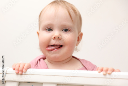 Portrait of cute baby in crib with bumper