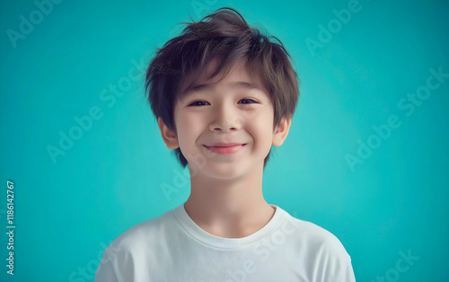 Portrait of cute boy smiling against blue backdrop.