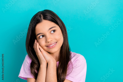 Portrait of cute dream schoolgirl kid preteen hands touch cheek looking empty space want find boyfriend isolated on cyan color background