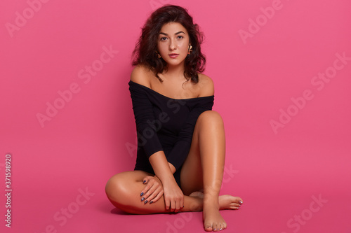 Portrait of cute female wearing black bodysuit, sitting on floor against rose wall, looks at camera, has dark wavy hair, posing with stylish earrings.