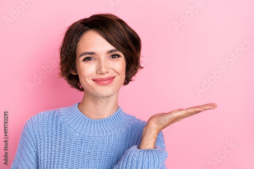 Portrait of cute funny positive female hold hands present new product promoter isolated on pink color background