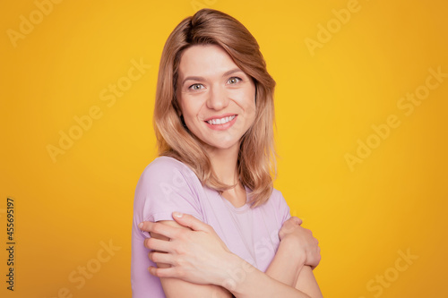 Portrait of cute lovely peaceful lady hands embrace shoulders on yellow background