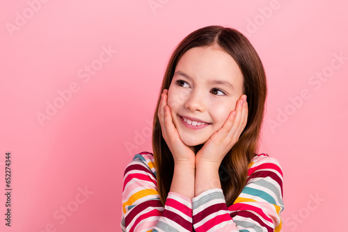 Portrait of cute small young girl touch cheeks minded thoughtful watching empty space optimistic dreams isolated on pink color background