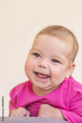 Portrait of Cute Smiling Caucasian Newborn LIttle Girl