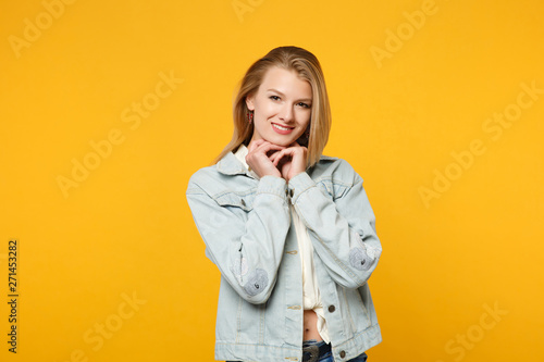Portrait of cute smiling young woman in denim casual clothes put hand prop up on chin, looking camera isolated on yellow orange wall background in studio. People lifestyle concept. Mock up copy space.