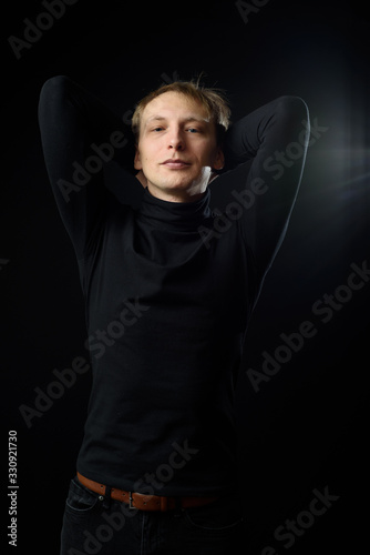 Portrait of determined goodlooking man wearing black shirt, black background.