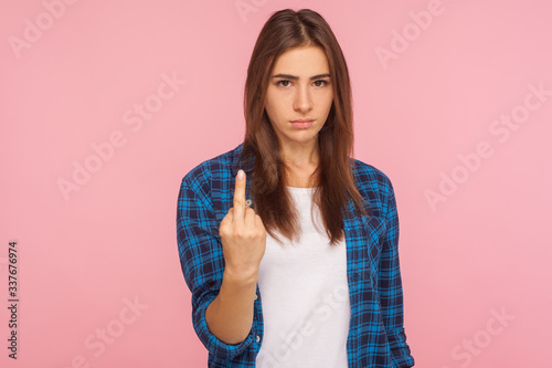 Portrait of displeased vulgar girl in checkered shirt showing middle finger, impolite rude gesture of disrespect and hate, looking angrily at camera. indoor studio shot isolated on pink background
