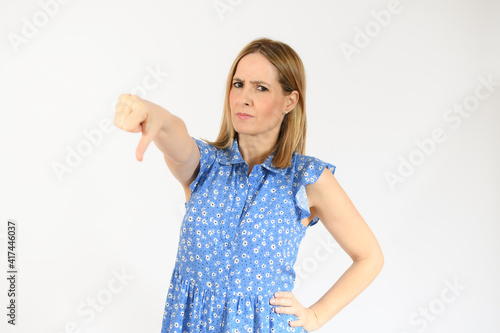 Portrait of displeased woman who is showing thumb down